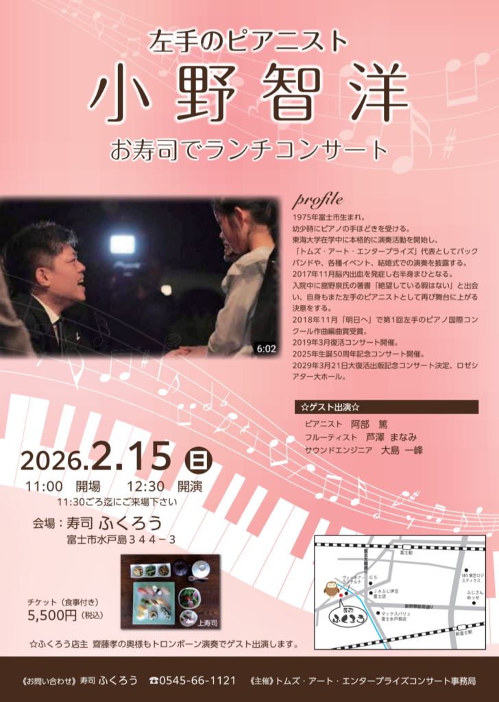 左手のピアニスト、小野智洋さんのコンサートを開催!